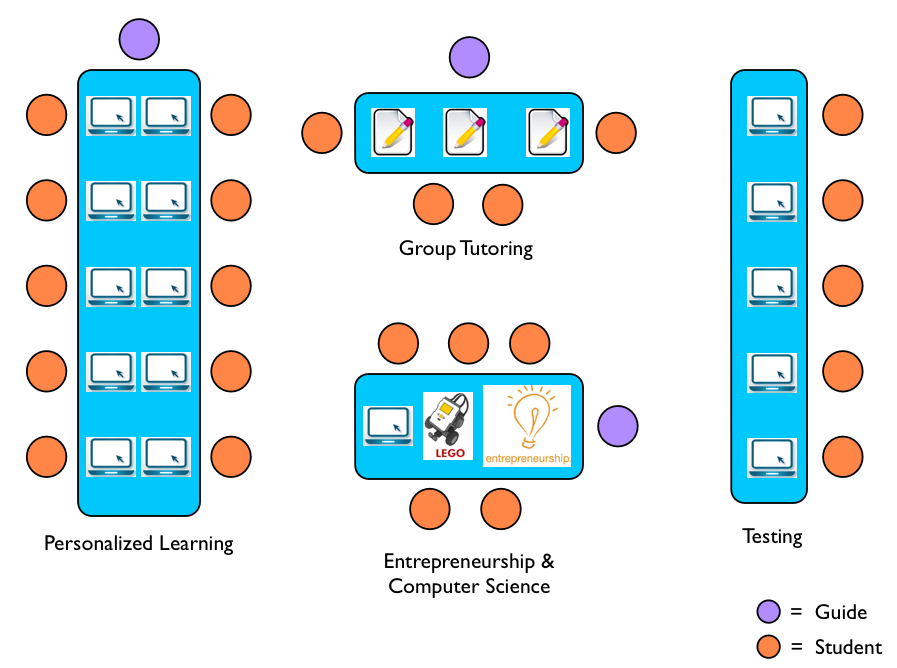 While some kids are setting their learning goals and going through personalized, teacher curated content on their laptops, students who are struggling with the curriculum are pulled in to small groups for group or 1:1 tutoring of core Math and English concepts. Students will rotate stations so that they can also be taught basic and advanced concepts in Entrepreneurship and Computer Science. These skills are then put in to practice in a group setting using LEGO robots, designing video games, brainstorming on how to market a product, learning money management and getting first hand experience in starting a business. When kids demonstrate mastery of an area, they are periodically tested to show what they have learned.